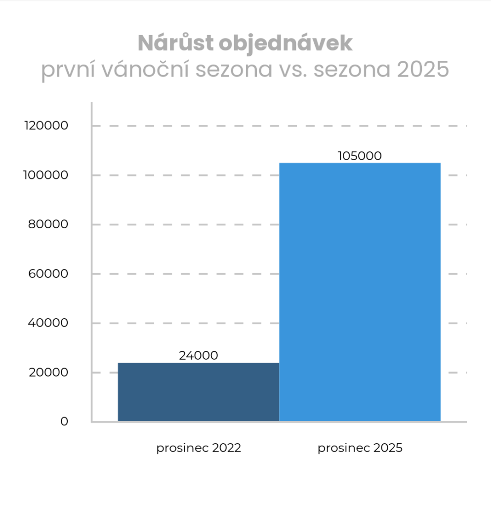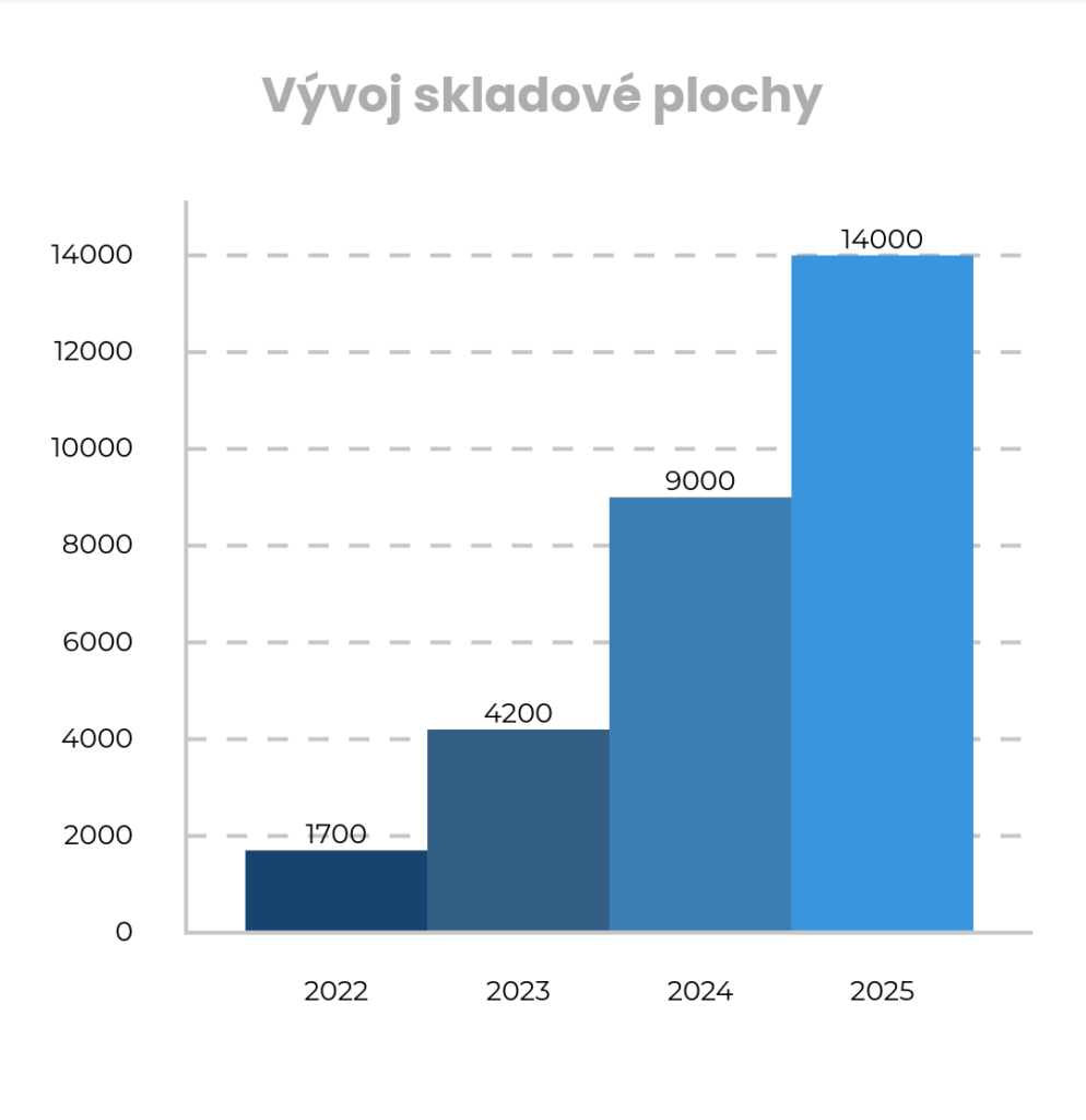 Před 3,5 lety firma fungovala na skladové ploše přibližně 1 700 m². V průběhu tohoto období se kapacita postupně rozšiřovala až na současných 14 000 m², což odpovídá nárůstu o 723 %. V průběhu roku 2025 jsme o plánovaném rozšíření opakovaně informovali a vánoční sezona byla jednou z etap jeho realizace. V prosinci došlo k rozšíření skladových prostor o 5 000 m², čímž celková skladová plocha dosáhla současné úrovně.